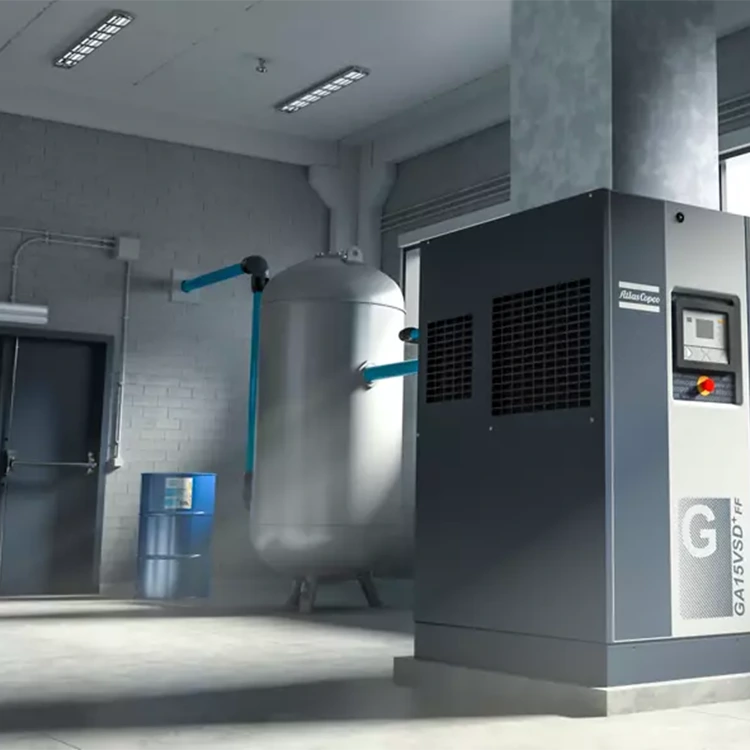 Alguns compressores de ar são “montados em tanque”, o que significa que são fornecidos como uma unidade completa e instalados na parte superior do tanque receptor de ar. O uso de compressores de ar tipo tanque não apenas economiza espaço, mas também reduz o custo inicial de instalação necessário para a instalação de secadores individuais. Essa configuração é muito comum em compressores de ar pequenos e a potência de saída geralmente não excede 26 quilowatts (ou 35 cavalos). Grandes compressores de ar não são adequados para projetos de instalação em tanques, pois isso resultaria em uma configuração pesada na parte superior, potencialmente representando riscos à segurança.