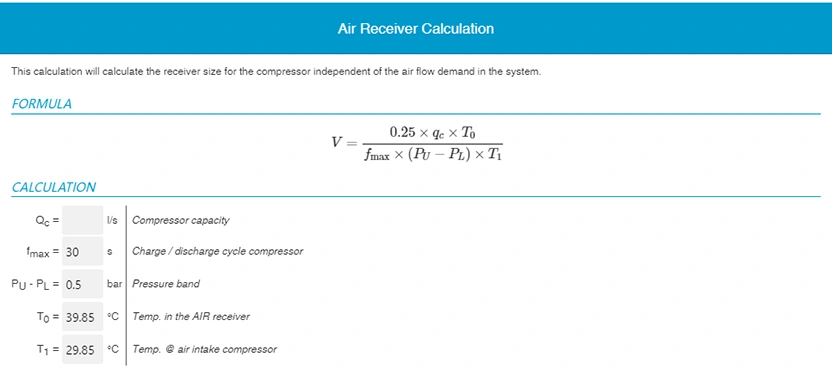 Uma boa regra para selecionar um tanque de armazenamento de ar é permitir 3-4 galões de ar por vazão CFM, ou 10-15 litros por litro de ar comprimido por segundo, dependendo do tipo de compressor de ar usado e da aplicação. Semelhante à seleção do compressor de ar, vários fatores devem ser considerados ao determinar as especificações apropriadas do tanque receptor de ar para o seu sistema. Os seguintes fatores são fortemente recomendados: