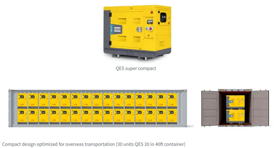 O inovador modelo QES supercompacto foi projetado para garantir o transporte mais eficiente. Você pode acomodar até 30 unidades do Atlas Copco QES 20 em um contêiner de 40 pés, o máximo para um gerador Atlas de potência de 20kVA no mercado! Significa transporte otimizado, emissões de CO2 e custos operacionais reduzidos, o que resulta num menor Custo Total de Propriedade (TCO). O seu design amigo do ambiente torna-o ideal para armazenamento no estrangeiro, reduzindo exponencialmente a sua pegada no local.