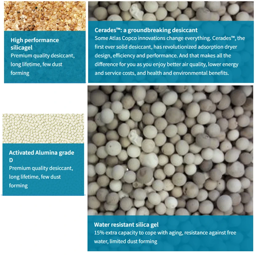 Dependendo da pressão do ponto de orvalho, os dessecantes podem ser feitos de alumina, sílica gel ou materiais de peneira molecular. O ponto de orvalho de pressão mínima pode atingir -70°C.