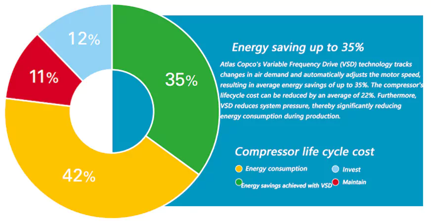 O consumo de energia representa mais de 80% do custo total do ciclo de vida de um compressor de ar de parafuso isento de óleo. Além disso, a electricidade utilizada na produção de ar comprimido representa mais de 40% dos custos totais de electricidade de uma fábrica. Para reduzir os custos de energia, a Atlas Copco foi pioneira na tecnologia de acionamento de frequência variável (VSD) na indústria de ar comprimido. O VSD não só economiza quantidades significativas de energia, mas também protege o meio ambiente para as gerações futuras. Graças ao investimento contínuo nesta tecnologia, a Atlas Copco é capaz de oferecer a mais ampla gama de compressores VSD integrados do mercado.