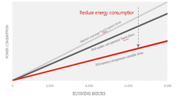 Todos os compressores de ar de parafuso RM adotam uma unidade principal totalmente nova de alta eficiência, combinando tecnologias de motor com eficiência energética IE3 de frequência fixa e inversor de ímã permanente ECO*-PM IE5, que podem economizar até 12-30% em custos de eletricidade.
