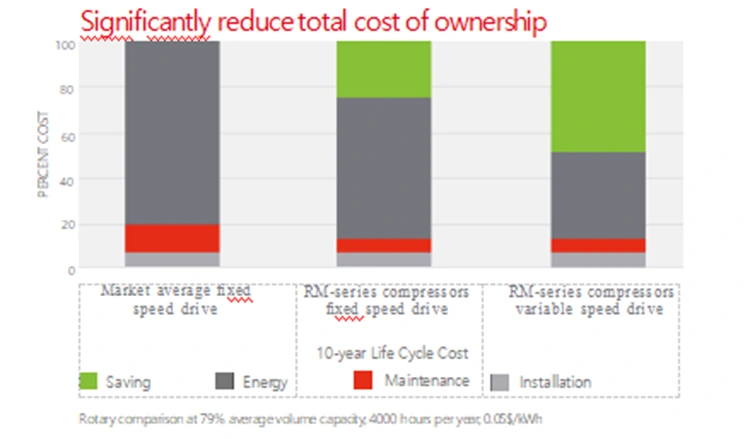cada compressor de ar da série RM é equipado com uma unidade principal totalmente nova e de alta eficiência, combinando um motor de velocidade fixa IE3 e tecnologia de motor de frequência variável ECO*-PM VSD IE5, ajudando você a economizar de 12 a 30% em custos de energia.
