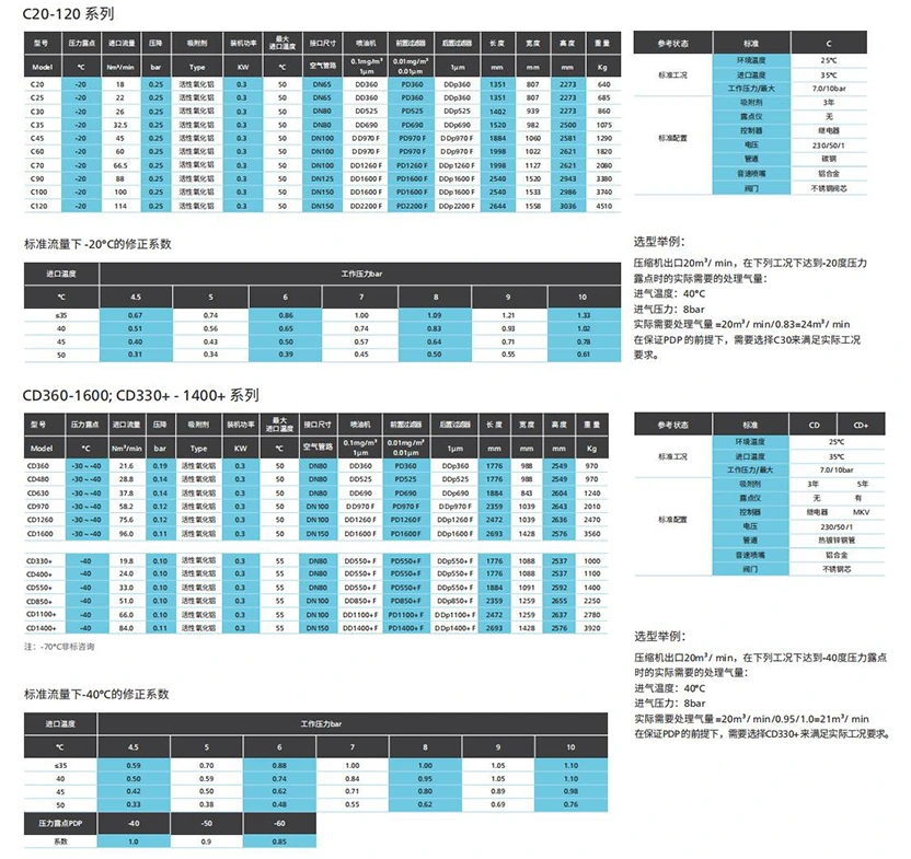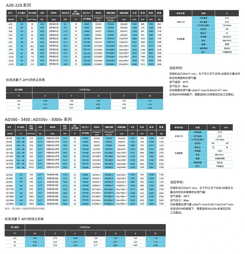 Dependendo da pressão do ponto de orvalho, o dessecante pode ser alumina, sílica gel ou materiais de peneira molecular. O ponto de orvalho de pressão mais baixa pode atingir -70°C.